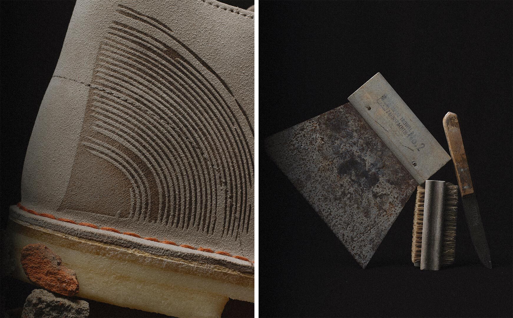 We’ve teamed up with Blended Materials to turn construction waste into wearable art. We were inspired by Tom’s process of turning rubble into gorgeous tiles and together with Clarks Originals and the 75th anniversary of the Desert Boot we’ve created a shoe that carries ‘materials with experience.’